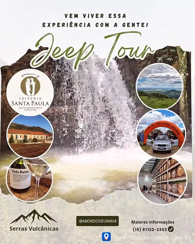 "A bordo de um 4x4" oferece passeios e expedições off-road pelas paisagens deslumbrantes da serra da mantiqueira. Com roteiros que exploram trilhas, cachoeiras e mirantes entre São João da Boa Vista e Águas da Prata, a experiência é ideal para quem busca aventura e contato com a natureza. Os passeios são guiados e proporcionam acesso a locais de difícil alcance. É a escolha perfeita para aventureiros, grupos de amigos e famílias que desejam descobrir os encantos da região de uma forma única e emocionante.