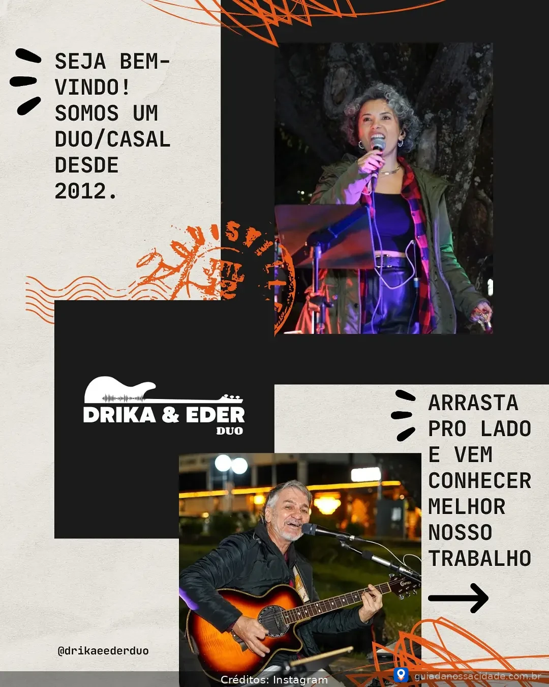 O Drika e Eder Duo é uma talentosa dupla de cantores que encanta o público em Águas da Prata com um repertório vibrante. Especializados em música ao vivo, eles apresentam versões acústicas de clássicos do pop rock e da MPB. O grande diferencial da dupla é a harmonia vocal e a energia contagiante, que se adapta a diferentes ambientes. São a escolha perfeita para animar seu bar, restaurante, festa particular ou evento corporativo com música de alta qualidade.