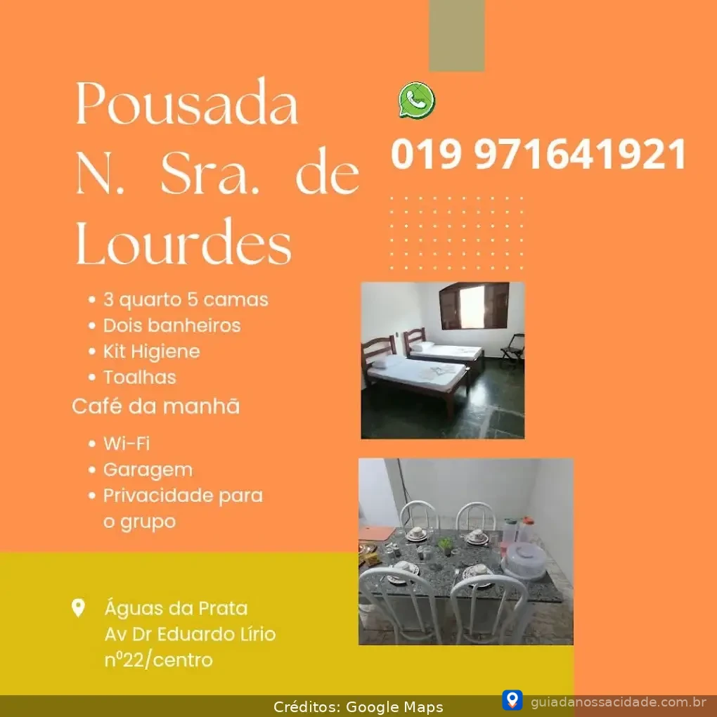 A Pousada Nsa de Lourdes oferece uma experiência acolhedora e tranquila no coração de Águas da Prata, SP. Localizada na Avenida Dr. Eduardo Lírio, a pousada é ideal para quem busca descanso e conforto em um ambiente familiar. Com fácil acesso às atrações turísticas da região, é o ponto de partida perfeito para explorar as belezas naturais e culturais da cidade. A pousada destaca-se pelo atendimento personalizado e pela atmosfera convidativa, garantindo uma estadia memorável para todos os hóspedes.