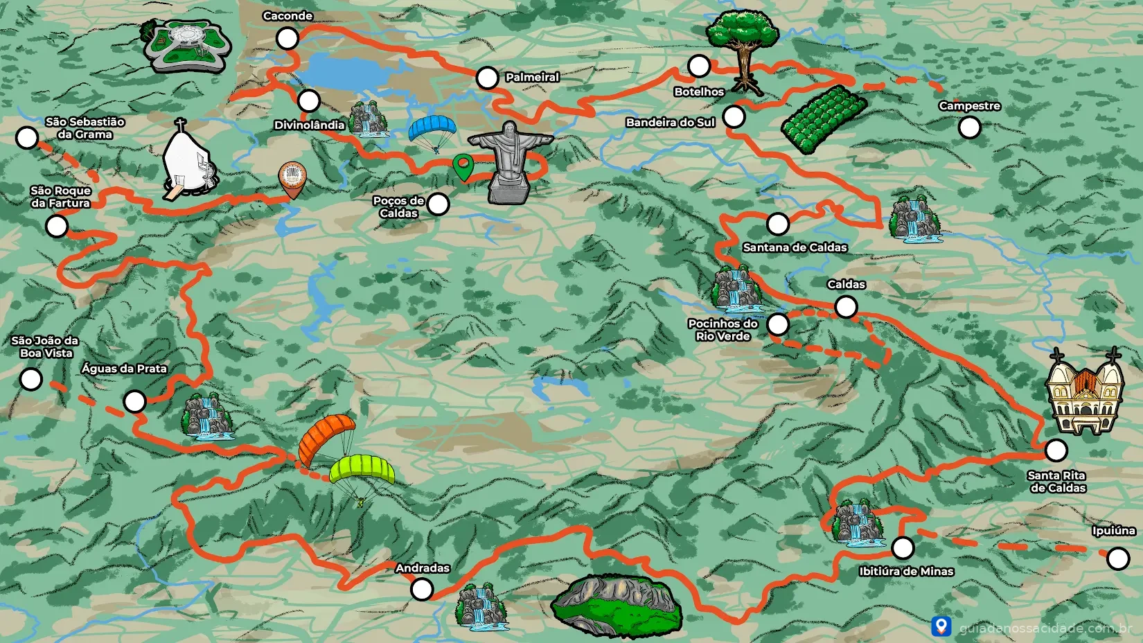 A Rota do Vulcão é um percurso turístico e cultural que percorre a região da antiga caldeira vulcânica de Poços de Caldas, uma das maiores do mundo. Ideal para cicloturismo e ecoturismo, a rota revela paisagens impressionantes, formações geológicas únicas e uma rica biodiversidade, tudo isso entre trilhas, cachoeiras, mirantes e cidades encantadoras.