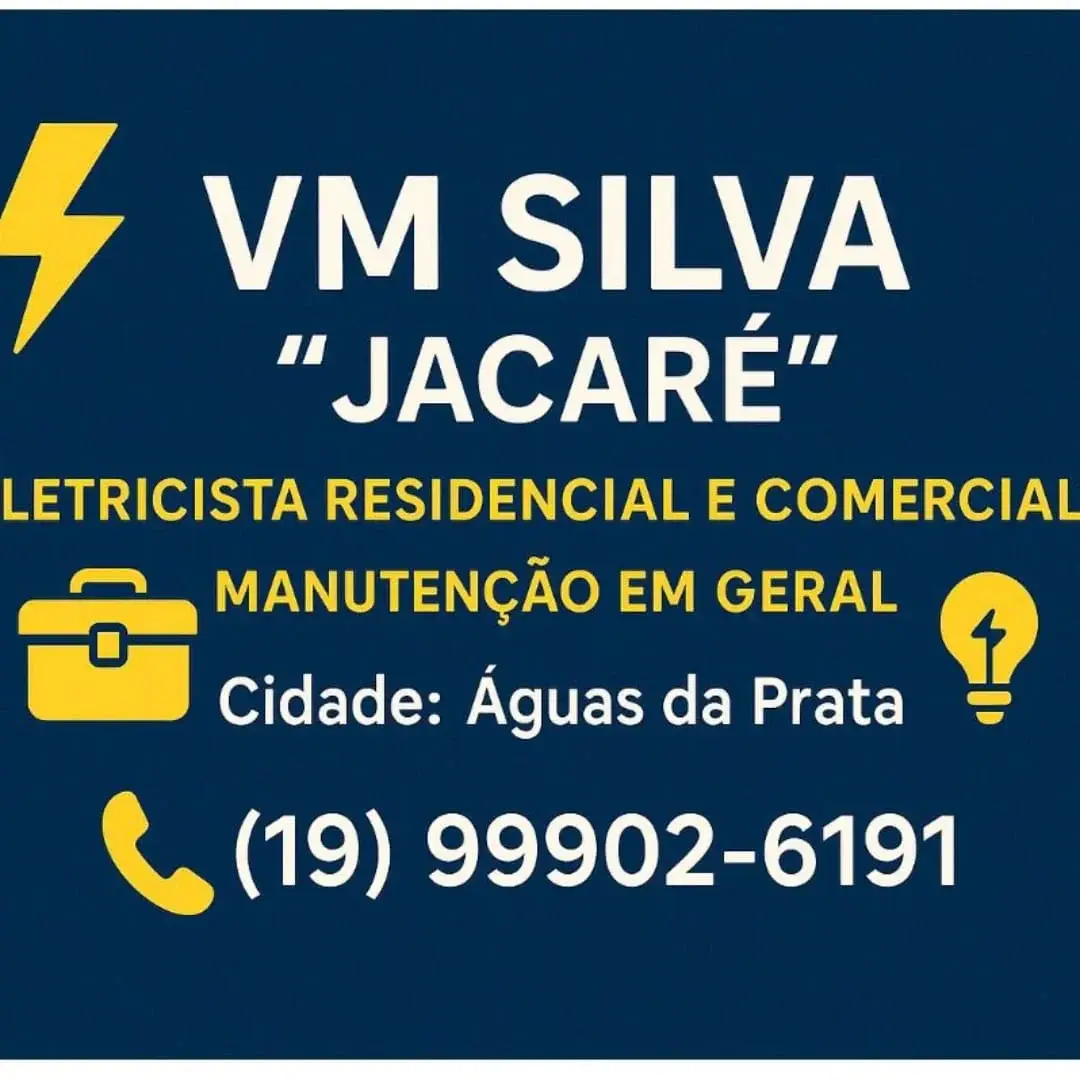 O VM Silva "Jacaré" Eletricista é um prestador de serviço qualificado em Águas da Prata, especializado em instalação e manutenção elétrica. Com atendimento focado em residências e comércios, oferece soluções seguras para reparos, novas instalações e manutenções preventivas. O diferencial é a confiança e a experiência de um profissional local. É a escolha ideal para quem precisa de um eletricista ágil e de confiança para resolver qualquer demanda elétrica.