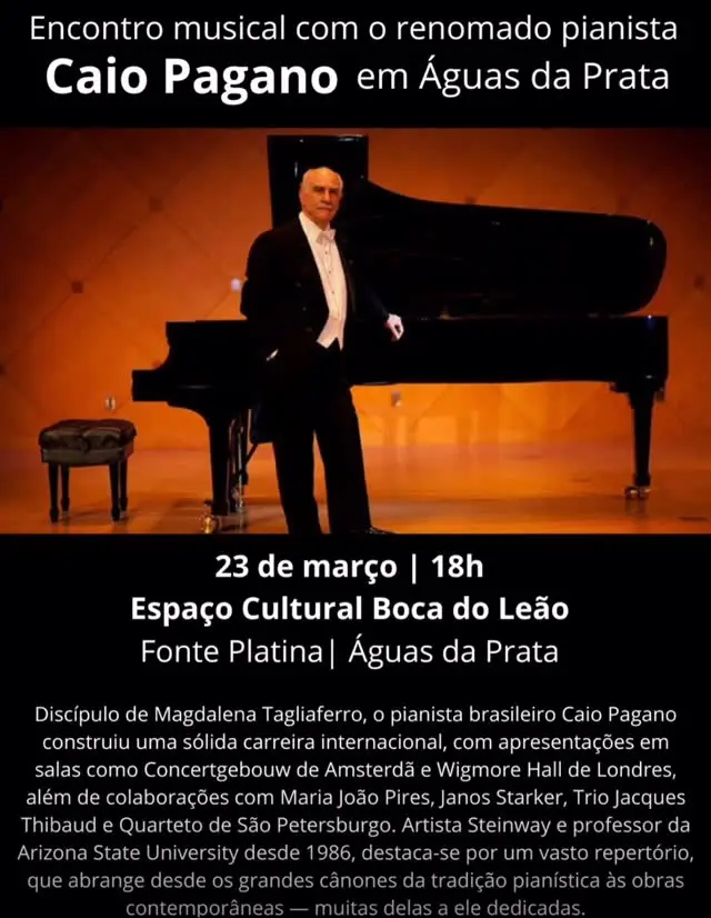 O Espaço Cultural Boca do Leão em Águas da Prata recebe um encontro musical imperdível com o renomado pianista Caio Pagano. Localizado na região da Fonte Platina, o espaço é um importante polo cultural que promove apresentações de alto nível artístico. Discípulo de Magdalena Tagliaferro e professor na Arizona State University, Caio Pagano traz para a cidade um vasto repertório que vai dos clássicos à música contemporânea. É uma oportunidade única para moradores e turistas apreciarem o talento de um artista Steinway de carreira internacional em um ambiente acolhedor e histórico.
