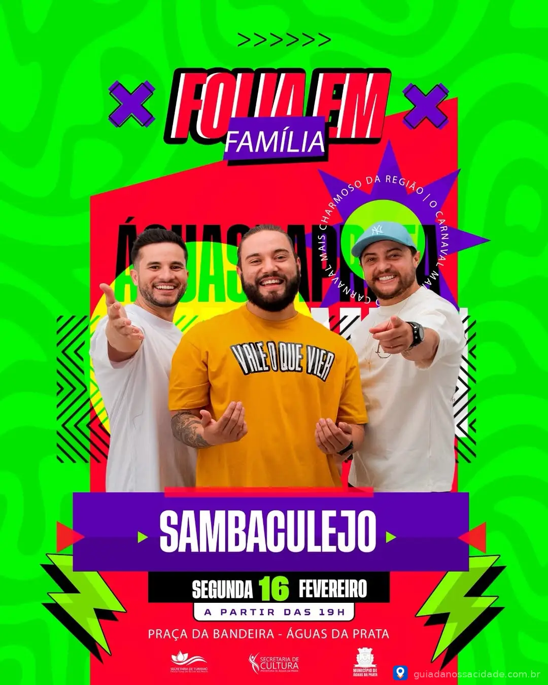 O Carnaval de Águas da Prata continua no dia 16 de fevereiro com uma programação imperdível na Praça da Bandeira. A segunda-feira de folia começa com a tradicional Matinê para a família (15h às 18h) e segue à noite com muito ritmo e alegria. A partir das 19h, a festa fica por conta da dobradinha que todo mundo ama: Roda de Samba Nona Madeira e Sambaculejo Prime, garantindo samba no pé e uma energia contagiante até a meia-noite.