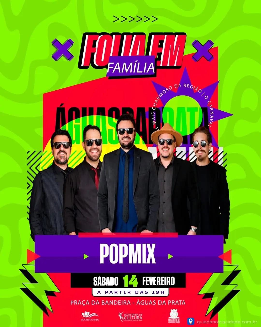 O Carnaval de Águas da Prata dá a largada no dia 14 de fevereiro com o tema "Folia em Família". O palco da Praça da Bandeira receberá shows explosivos da Banda Sigma e Banda Popmix a partir das 19h, prometendo muita animação e hits variados. Além da música noturna, o evento confirma a tradição das matinês diárias e o divertido concurso de fantasias, fazendo desta festa o destino ideal para quem busca o carnaval mais charmoso e seguro da região.