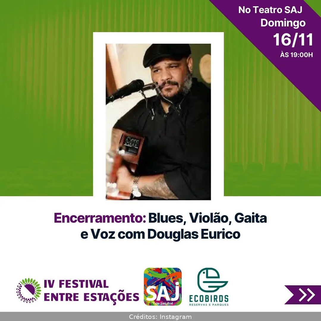 No domingo, 16/11, o Teatro SAJ recebe Douglas Eurico para o encerramento do IV Festival Entre Estações, com um show intimista de blues, violão, gaita e voz que promete emocionar o público. 🎸🎤💙