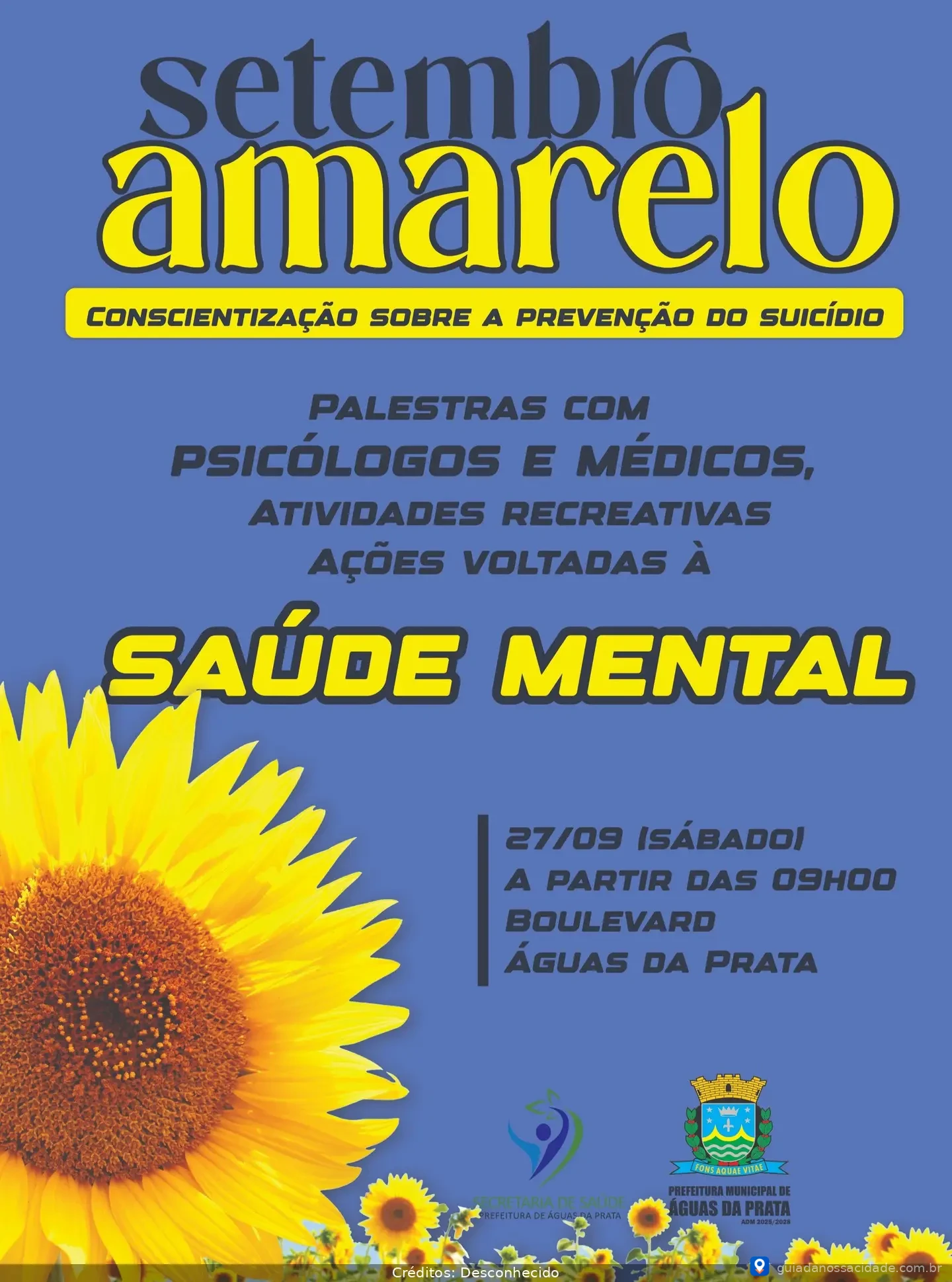 Neste dia 27/09 (sábado), a Secretaria Municipal de Saúde da prefeitura de Águas da Prata promove uma série de atividades no Boulevard em celebração ao “Setembro Amarelo”.